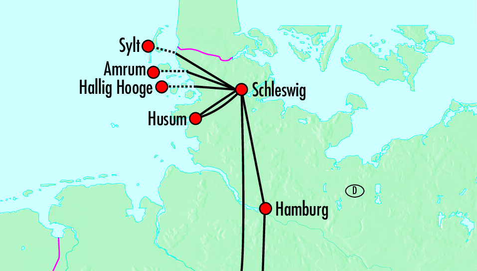 4. Tag Hallig HoogeAn reizvollen Dörfern vorbei geht es zum nahegelegenen Fährhafen, wo das Schiff zur Insel Hallig Hooge ablegt. Nach einer ca. 1-stündigen Überfahrt gilt es, die Insel mit all ihren Eigenheiten und Sehenswürdigkeiten wie Königsspesel, Kirche oder das Sturmflutkino, in dem über das gefährliche Leben auf der Hallig berichtet wird, zu erleben. Ob zu Fuss, per Fahrrad oder per Kutsche - Hallig Hooge begeistert. Auf der Rückfahrt darf eine Stippvisite in Husum, der "grauen Stadt am Meer" auf keinen Fall fehlen. Die "Metropole" an der Nordseeküste Nordfrieslands bietet ein reiches Kultur- und Veranstaltungsprogramm und attraktive Shopping- und Freizeitangebote. Die Kombination aus Stadtleben, Natur und typisch nordfriesischer Tradition macht Husum zu einem beliebten Ferienziel.