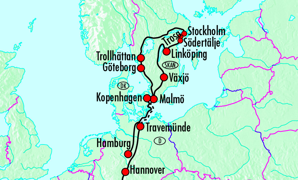 8. Tag Trollhättan - Göteborg - MalmöEs geht weiter in die Westküstenmetropole Göteborg, wo Sie zu einer Stadtrundfahrt erwartet werden. Die Industriestadt präsentiert sich heute grün und von zahlreichen Kanälen durchzogen. Schliesslich fahren Sie zurück nach Malmö, wo Sie auf die Finnlines nach Travemünde einschiffen.