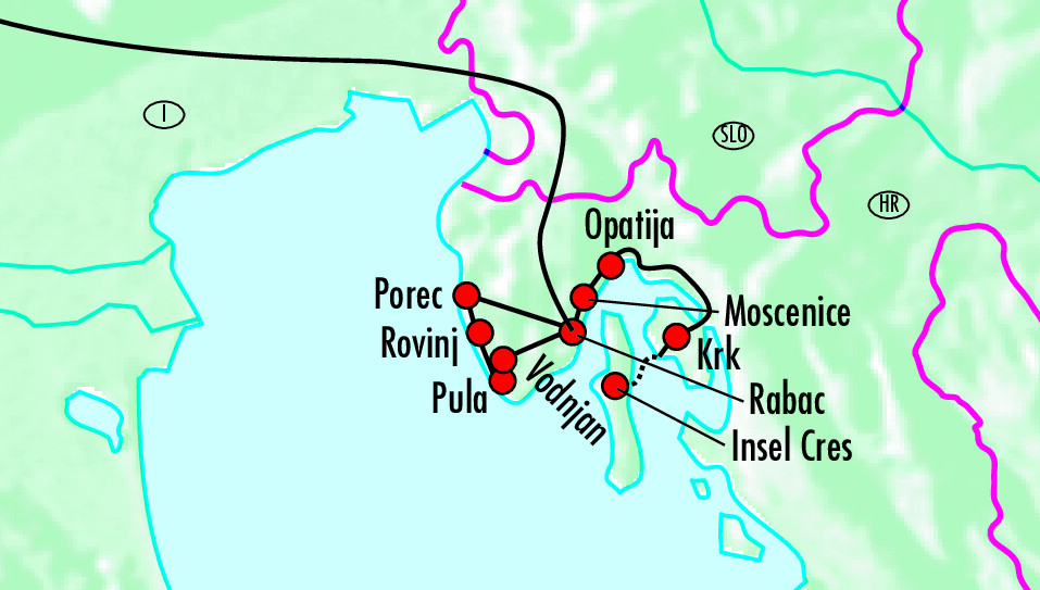 Entdecken Sie die ganze Vielfalt Istriens. Von Ihrem Standort aus in Rabac bereisen Sie diese facettenreiche Halbinsel. Unternehmen Sie einen Ausflug in die Küstenstadt Rovinj und geniessen Sie Ausblicke auf die traumhafte Riviera und das leuchtend blaue Meer. Auch Ihren Gaumen verwöhnen Sie u.a. bei einer Weinprobe und bei einer Verkostung istrischen Schinkens. Genuss pur für Gaumen und Augen!